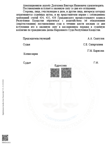 Постановление судбеной коллегии по гражданским делам Верховного Суда РК (полный текст документа)