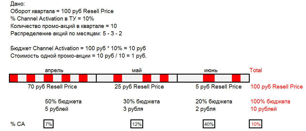 Такой расчет делается внутри календарного квартала. Поэтому для отдельных месяцев внутри квартала может получиться разный процент инвестиций от оборота, в зависимости от того как распределены промо-акции.