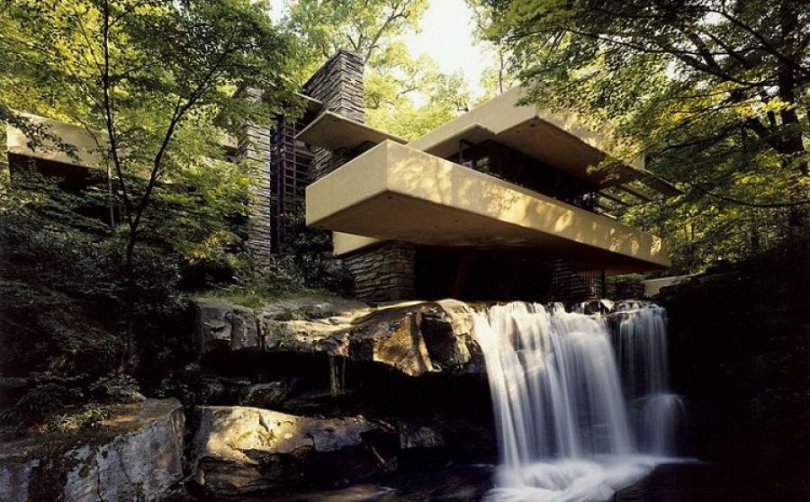 "Дом над водопадом" Фрэнк Ллойд Райт построил для семьи Эдгара и Лилианы Кауфманн в 1935 году . "Дом над водопадом" стоит на скалах и как будто вырастает из них, горизонтальные членения его бетонных террас вторят слоистой структуре местного камня .