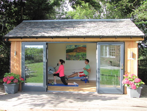 1 . Офис в тени Где: Лондон, Великобритания Дизайнер проекта: Gurmeet Sian Этот домик, спрятанный в лондонском саду, служит домашним офисом . Фасад — это полноскладные двери .