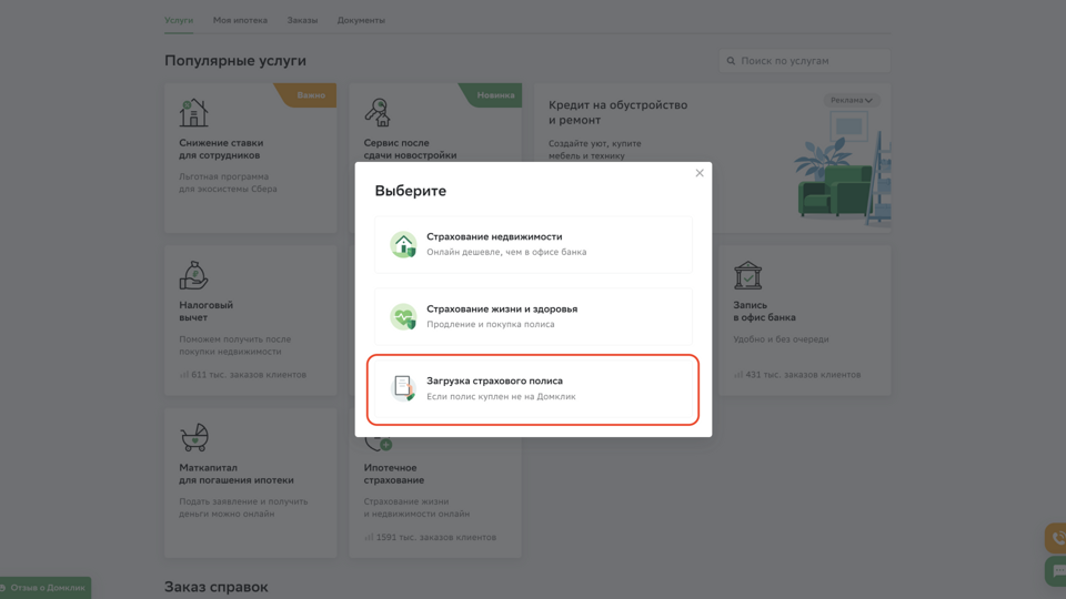 Домклик передать полис страхования
