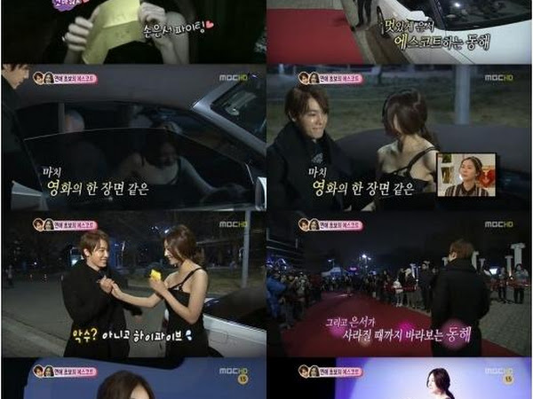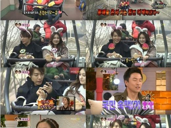 On January 19th, an online community board featured a posting titled, " Donghae and Son Eun Seo's Amusement Park Date ." In the photo, Donghae and Son Eun Seo are seen on a double date at an amusement park with 'We Got Married's couple Leeteuk and Kang Sora . Both couples were seen holding hands regardless of the large number of onlookers .