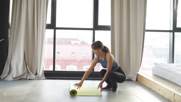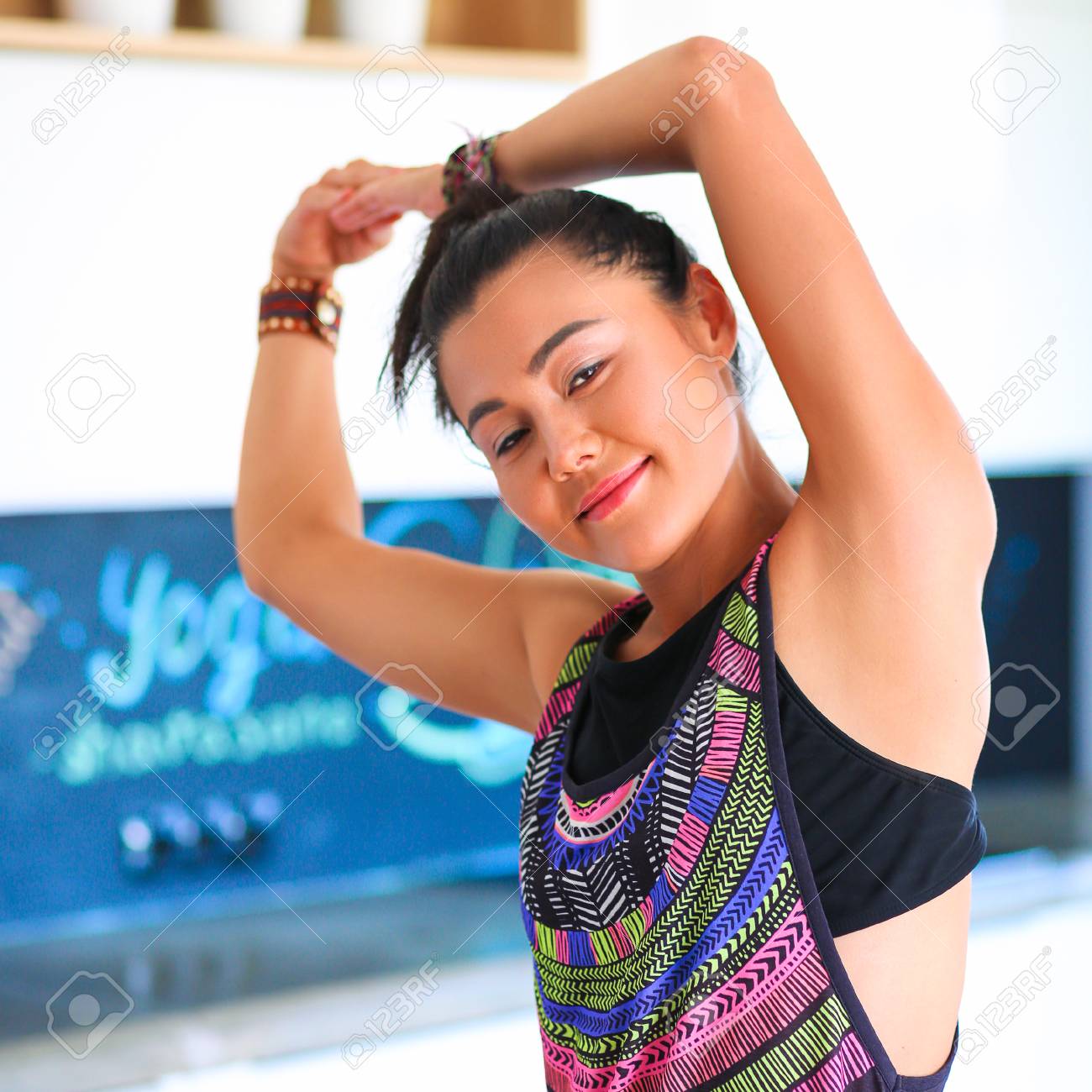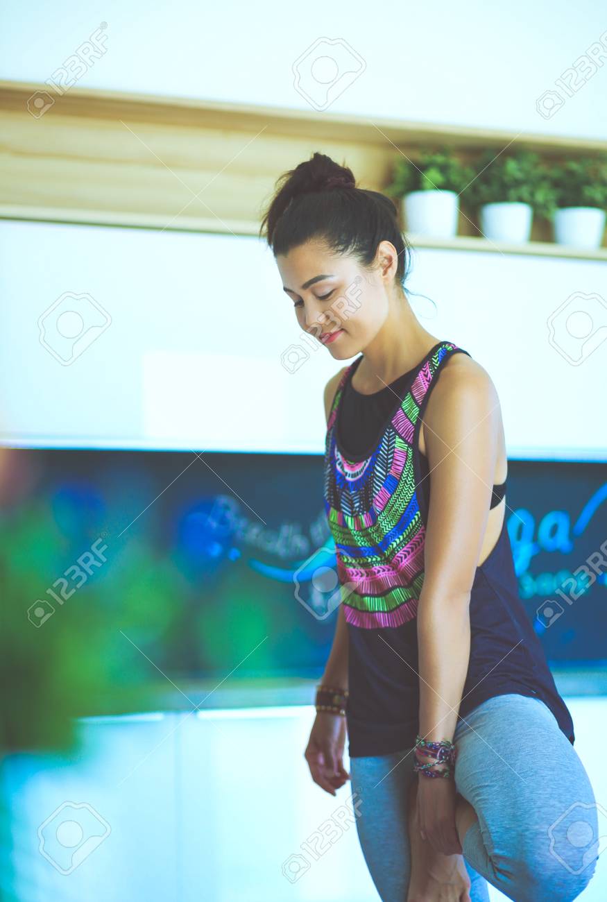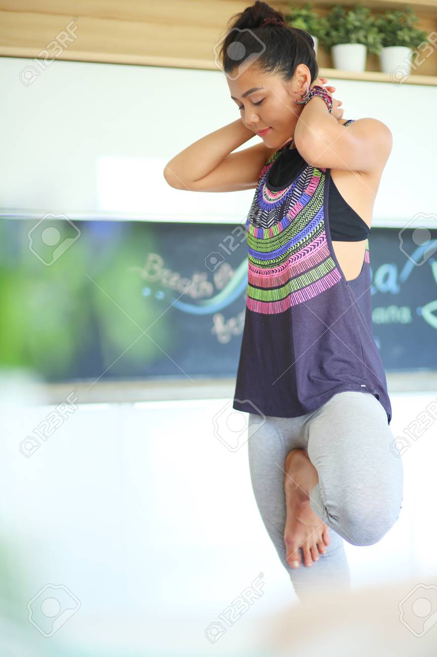 Donna asiatica dell'istruttore di yoga che per mezzo del . . .