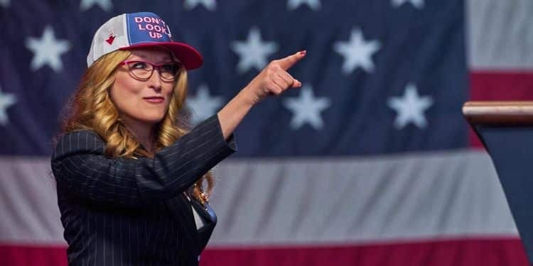 На песке метафорически прочерчена линия — сторонники науки с лозунгом «Просто посмотри вверх» на одной стороне политического спектра и лозунг президента Орлеана «Не смотри вверх», который игнорирует факты и утверждает, что ученые попросту держат людей в страхе, на другой стороне.