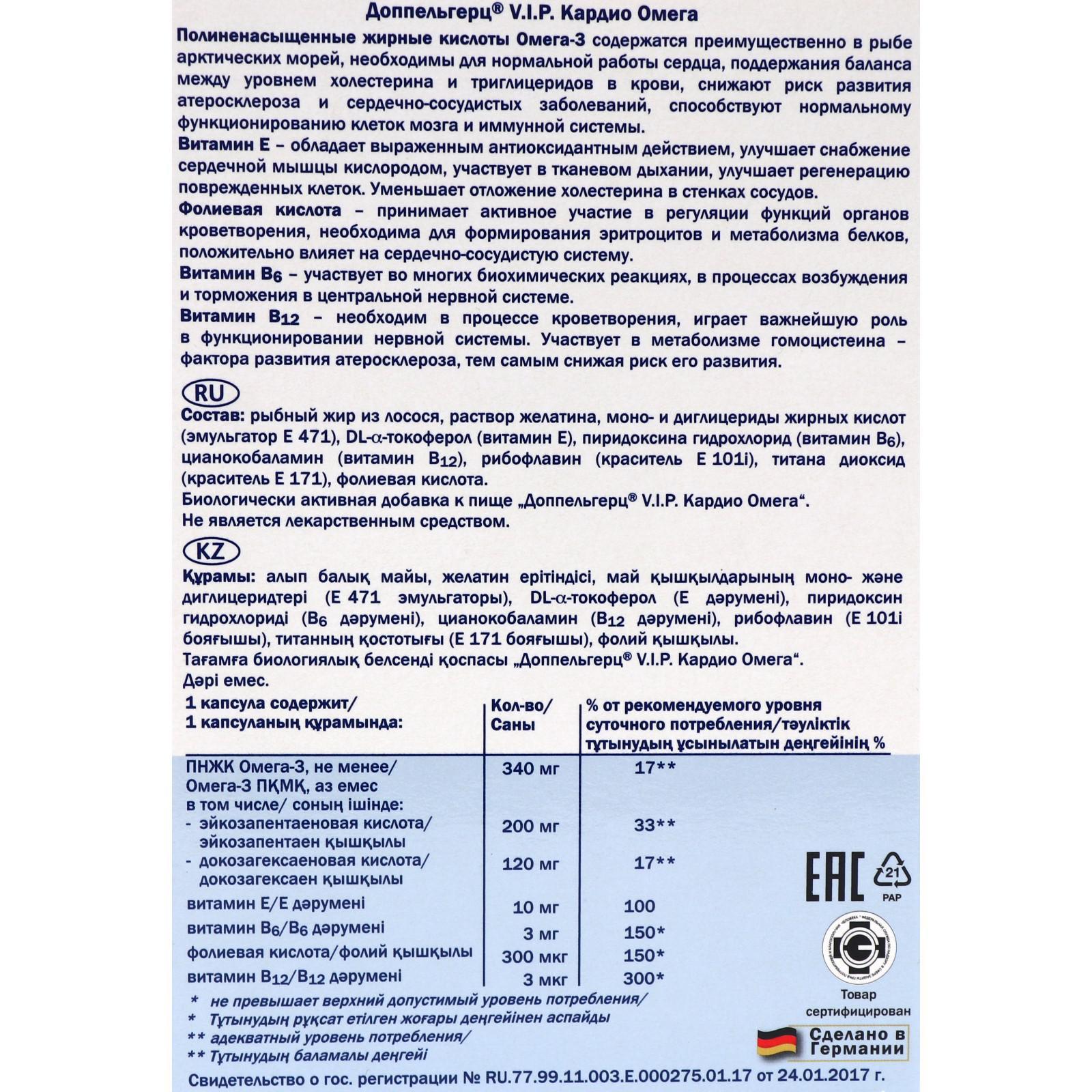 Доппельгерц VIP Кардио Омега капсулы №30 цена — ⭐900 ₽ ⭐, купить в интернет аптеке Aptstore в Москве .