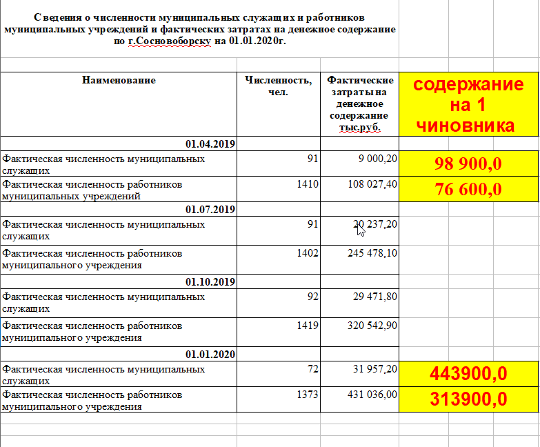 Это "Сведения о численности муниципальных служащих и работников муниципальных учреждений и фактических затратах на их денежное содержание по г.Сосновоборску на 01.01.2020г."