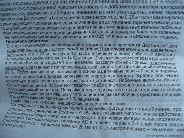Побочные эффекты В ходе клинических исследований с применением Достинекса для предотвращения физиологической лактации (1 мг однократно) и для подавления лактации (по 0,25 мг каждые 12 ч в течение 2 дней) побочные действия отмечались приблизительно у 14% женщин .