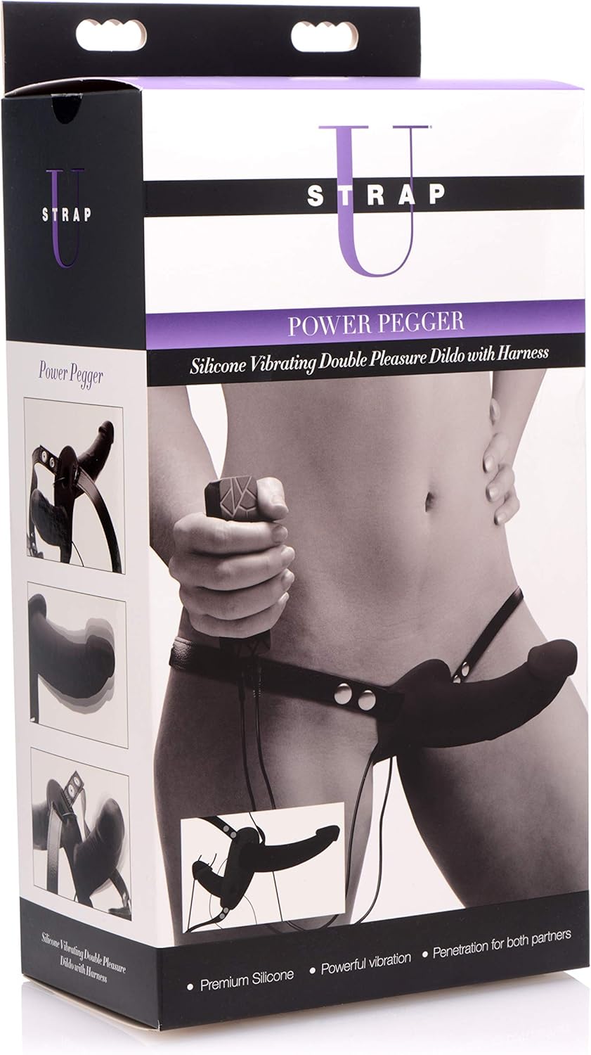 Vibrating double-ended dildo and strap-on harness set for pegging and strap-on play Curved silicone shafts with semi-realistic heads target pleasure points for both wearer and receiver Wired controller allows both users to control the 3 speeds and 7 patterns