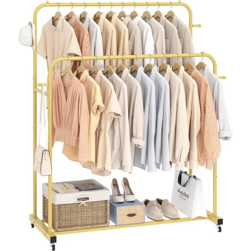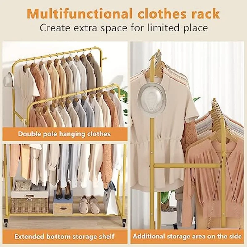 AjeymGpcHere you can buy Double Rods Garment Rack with Wheels, Clothing Rack for Hanging Clothes,4 Hooks, Multi-Functional Bedroom Clothes Rack with free delivery to your post office.