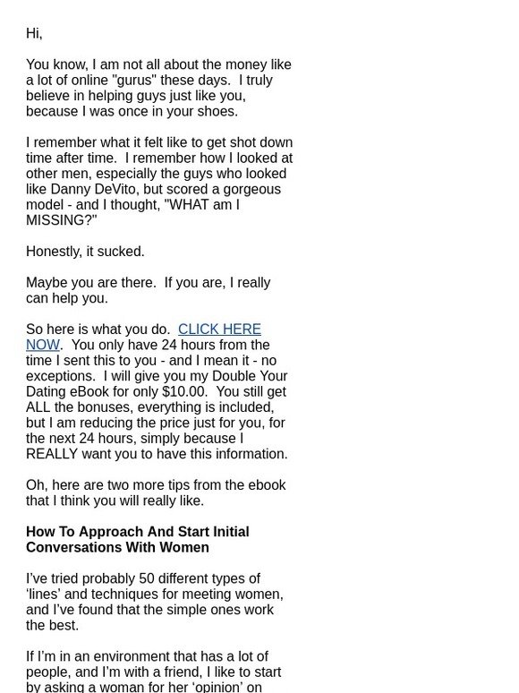 Read " Double Your Dating " RISK FREE For 7 Days . This is possibly the most important investment you'll ever make in your dating life . I assure you that you'll be able to use the things that you'll learn in my Ebook to meet more women .