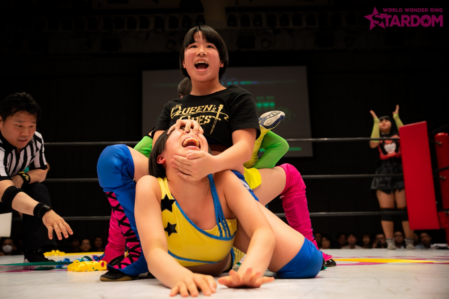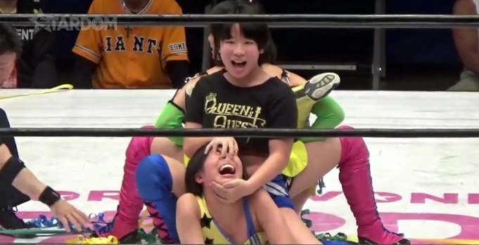 A double camel clutch that left poor Aziza and Aoko submitting! And their ghostly pal Boo watching in distress in the background!