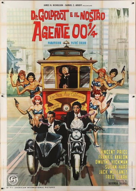 Dr. Goldfoot and the Bikini Machine is a 1965 American International Pictures comedy film, made in Pathécolor, directed by Norman Taurog. It stars Vincent Price, Frankie Avalon, Dwayne Hickman, Susan Hart and Jack Mullaney, and features Fred Clark. It is a parody of the then-popular spy film trend (the title is a spoof of two James Bond films: the 1962 film Dr. No and the 1964 hit Goldfinger), made using actors from AIP's beach party and Edgar Allan Poe films.