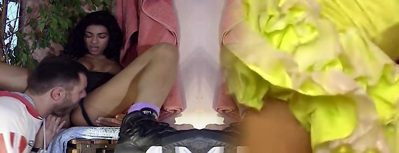 Sexy brunette in jeans walks around in her favorite shop