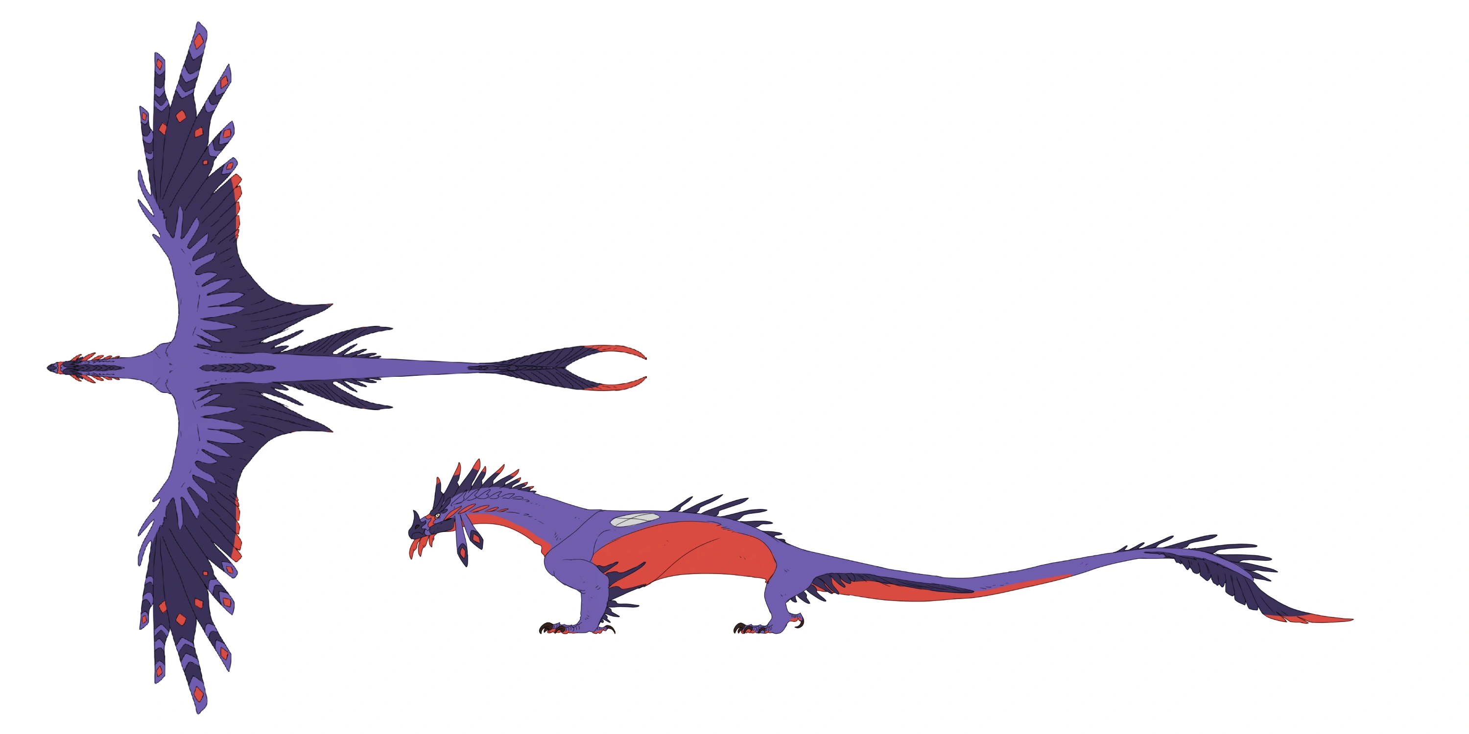 The Mother Dragon is nicknamed "Feather Dragon" for all of the feathers on its body . Its titanic wings have four noticeable flight feathers that have stripes and rhombuses on the ends . This dragon walks on four legs, and drags its tail, swaying behind it . The tail has feathers running down the sides, along with large curved ones at the tip .
