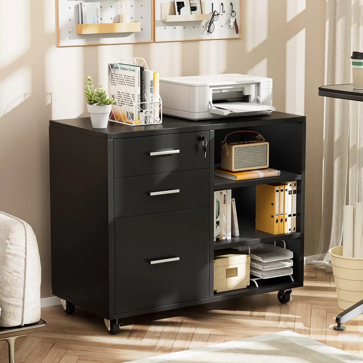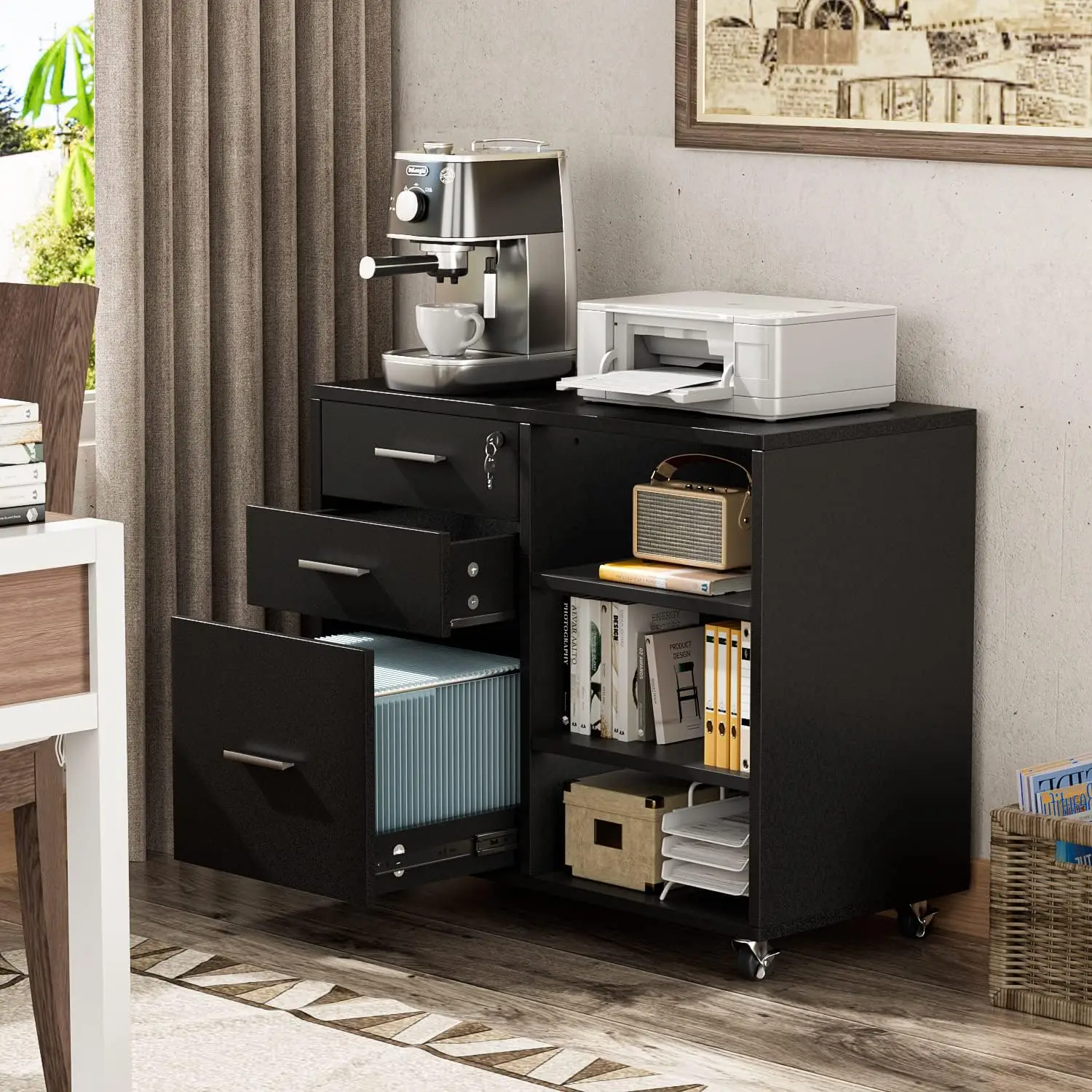 Drawer Mobile File Cabinet, Wood Lateral Printer Adjustable Open Storage Shelf, Lockable Wheels for Home Office, Black Filing ca - Купить с бесплатной доставкой