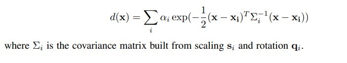 - Then the authors query a 8^3 dense grid inside each block, which leads to a final 1283 dense grid. For each query at grid position x, the authors sum up the weighted opacity of each remaining 3D Gaussian: