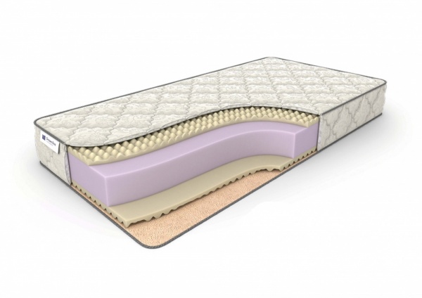 Беспружинный матрас на основе плиты из пенополиуретана с массажной пеной Ergo Foam. Пенополиуретан - эластичный, умеренно мягкий наполнитель, долговечный, гипоалергенный, обладает отличными анатомическими свойствами, повторяет форму тела спящего, делает сон максимально комфортным. Поверх пенополиуретана с обеих сторон расположен слой эластичной рифленой пены, которая обладает отличным массажным эффектом, улучшает кровоток.