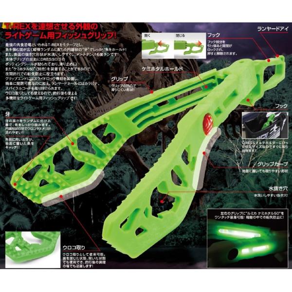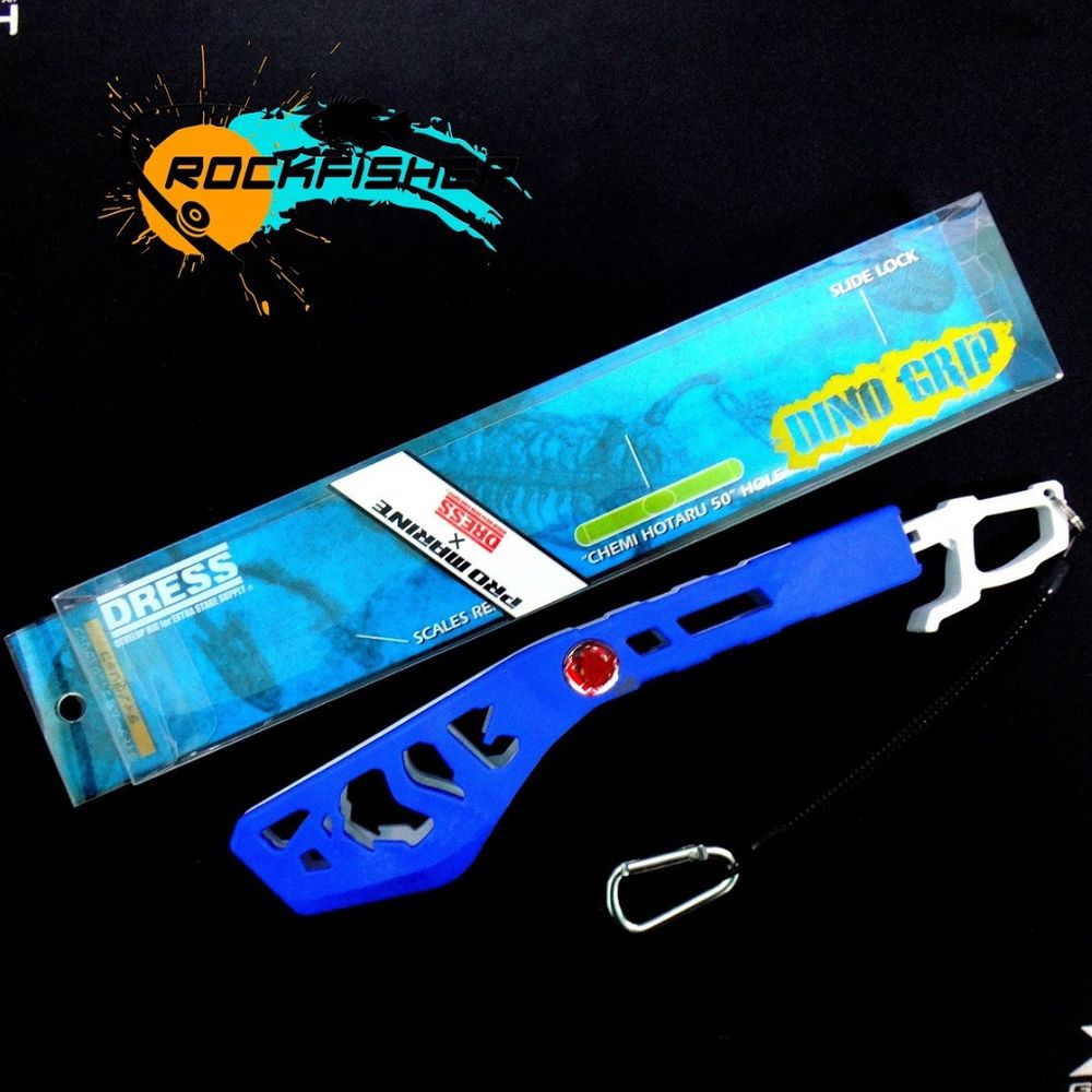 DRESS DINO Grip is a fish grip inspired by the fierce teeth of the Tyrannosaurus Rex . The broad gripping surface is randomly covered with cone shaped teeth for solid grasping . The surrounding edge teeth is also designed for scaling . Quick open/shut motion with slide lock hook on the grip end .