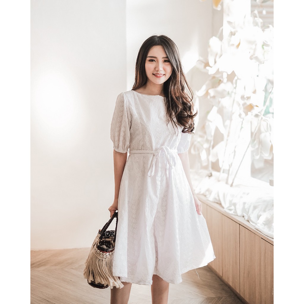 Women's medium length dress with white hollow bubble sleeves