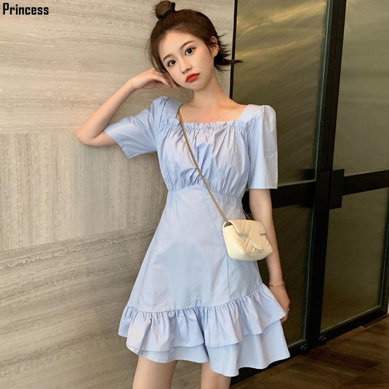 Dresses for Women Sweet Puff Sleeve Floral Print Square Collar Mid-Calf Summer Dress Korea Chic Slim Women's Summer Sundresses
