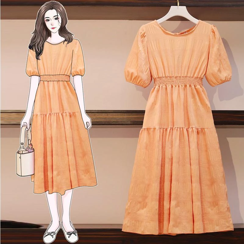 new fashion literary easy leisure closed reduction age show thin waist joker pure color short-sleeved dress is female