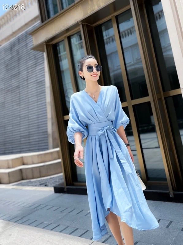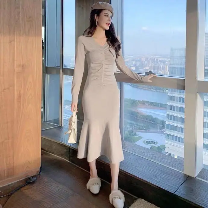 Autumn Winter Slim Dress Fashion Woman Solid color folds Dress Ladies Seven-Point Sleeve V-neck Slim Pleated Dress