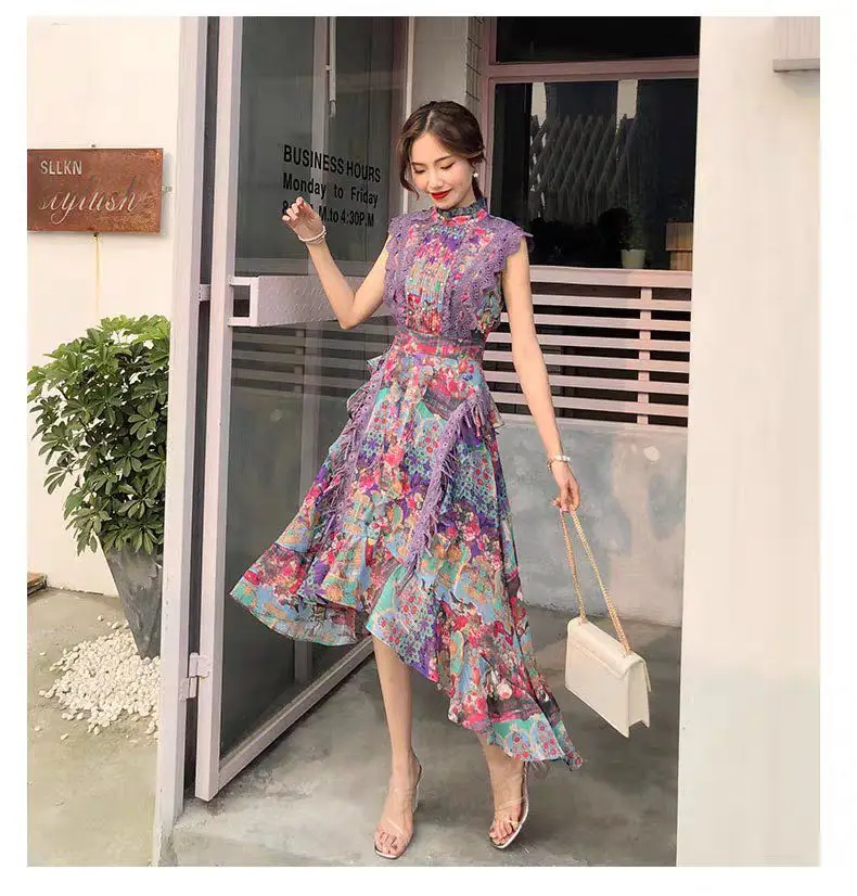 M21ds293 Women's Wear 2022 Summer New Casual Print Stitching Pleated Sleeveless Dress