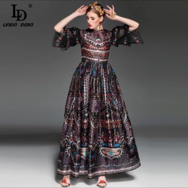 Korea Chic Dress Summer Dress Elegant Round Neck Care Hollow Out Waist Printing Vest Dress Long Skirt