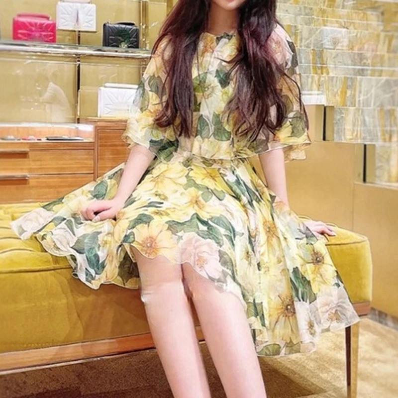 Yiyiyouni Summer Chiffon Leaves Print Mini Dresses Women Casual Long Sleeve Sashes A-Line Dress Female O-Neck Short Dress Women