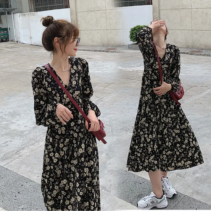 2022 Floral Print Woman Dress Casual V-neck Long Puff Sleeve Autumn Midi Dresses Chic Elastic Waist Button Beach Female Dress