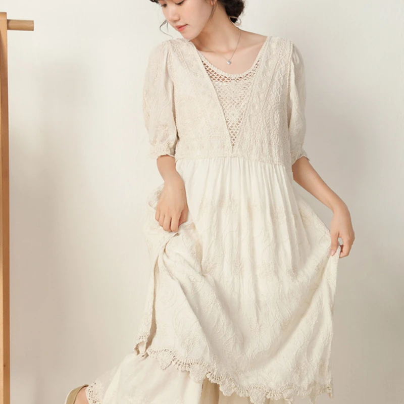Cottagecor Resort Dress Women Lantern Sleeve Sexy Backless Embroidery Dress