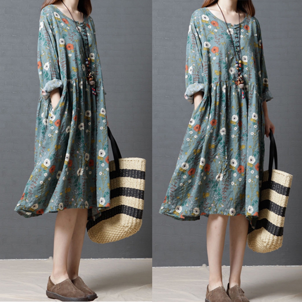 Vintage Dress Sleeveless Women O-Neck Size Maxi Plus Floral Print Long Bohemian Size S-5XL