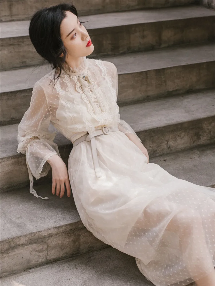 Summer Women Princess Long Tulle Dress Square Collar Polka Dot Bandage Feminine Dress Floral Embroidery Elegant Mesh Dresses