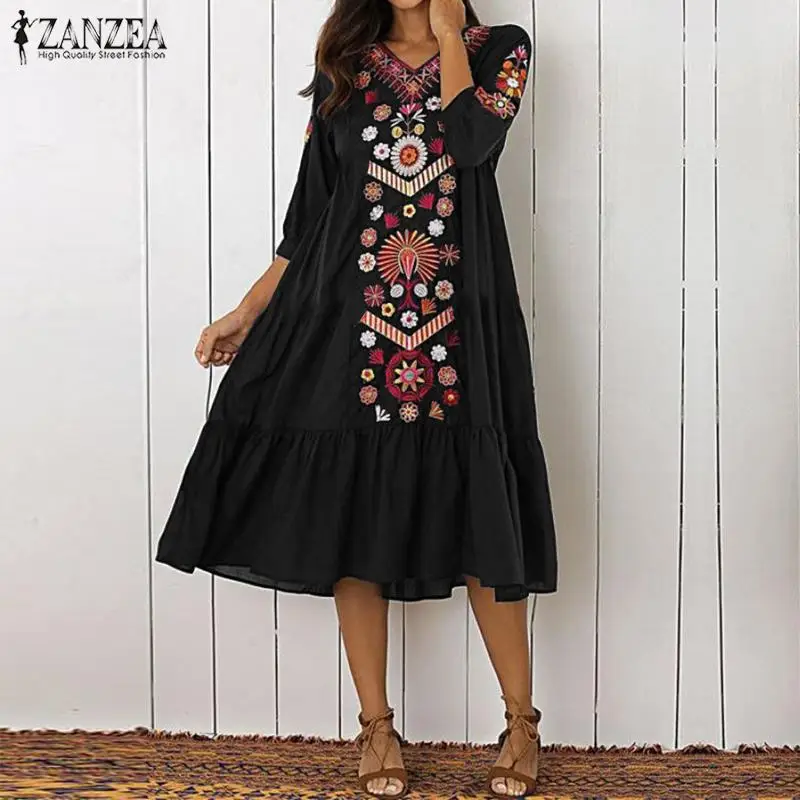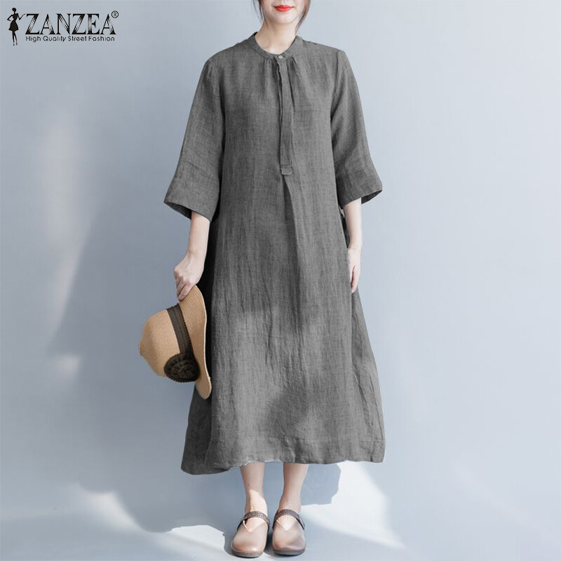 Summer Cotton Linen Dress ZANZEA Women 3/4 Sleeve Solid Autumn Sundress Elegant O neck Loose Work Vestido Robe Femme Dresses