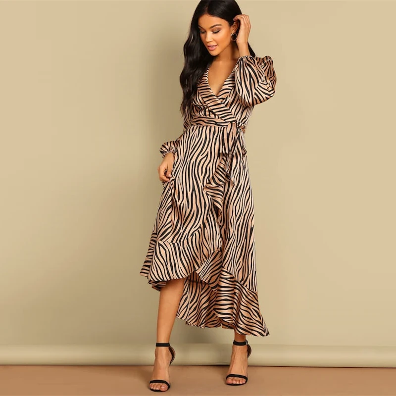 Evfer Women New Sprint Animal Zebra Print Za Satin Feeling Long Dresses Female Fashion V-Neck High Waist Slim Dress With Belt
