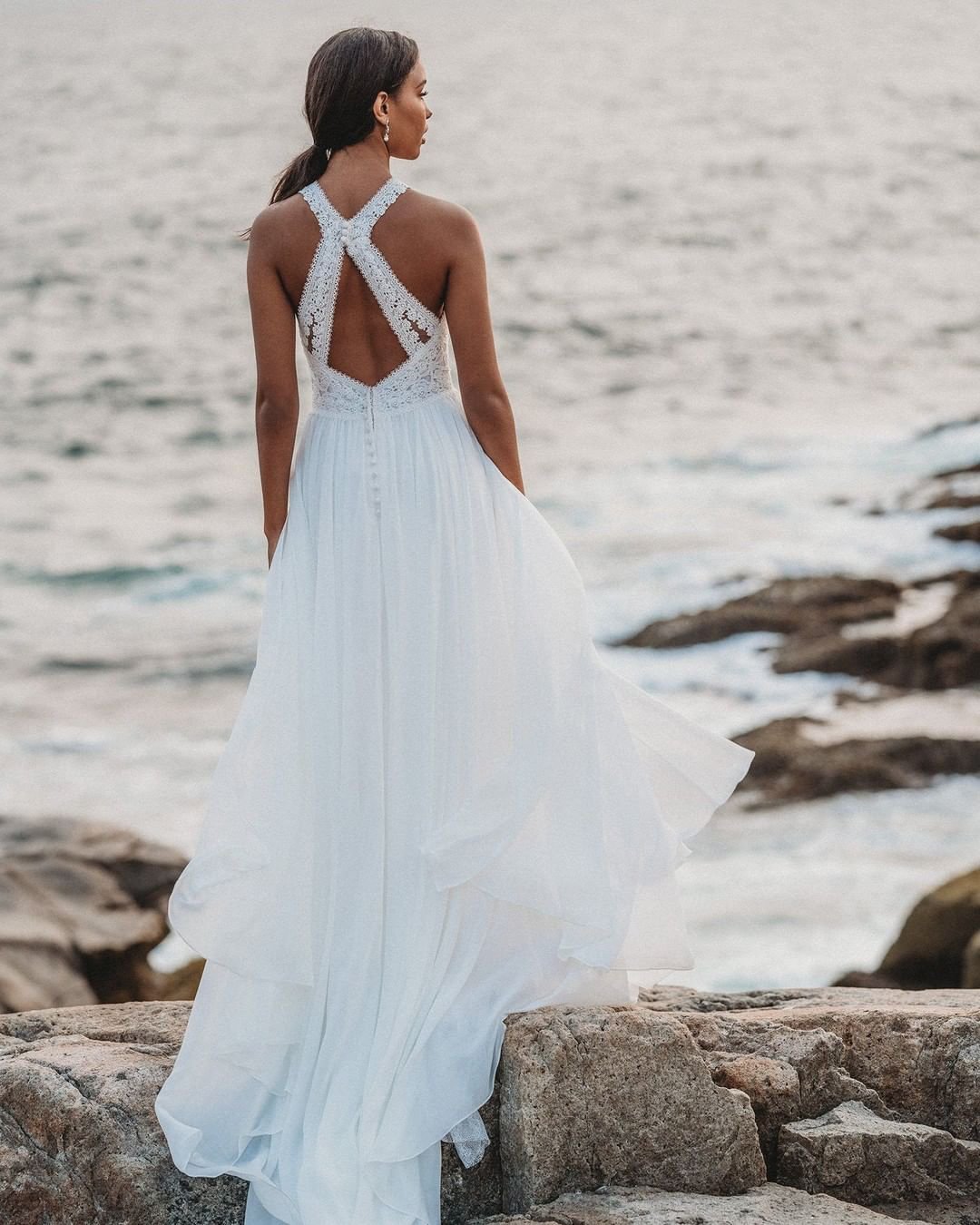 Ivory Lace V-neck Open Back Mermaid Beach Wedding Dress . $269 Halter Neck Lace & Tulle Princess Wedding Ball Gown . $469 Floral Lace Tulle V Neck Sleeveless Casual Wedding Gown . $319 Open Back White Lace and Chiffon Boho Wedding Dress . $229 Beaded Lace V-neck Mermaid Modern Wedding Dress .