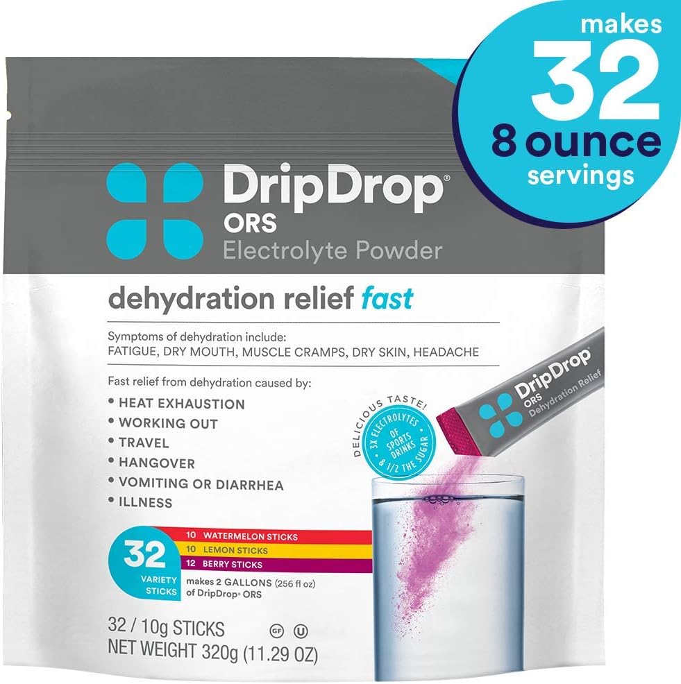 DripDrop ORS - BIG Sticks - Electrolyte Powder For Dehydration Relief Fast - For Workout, Sweating, Illness, & Travel Recovery - Watermelon, Berry, Lemon Variety Pack - 12 x 16oz Servings 12 Count (Pack of 1) 4 .5 out of 5 stars1,347 $27 .16$27 .16($3 .06/Ounce)