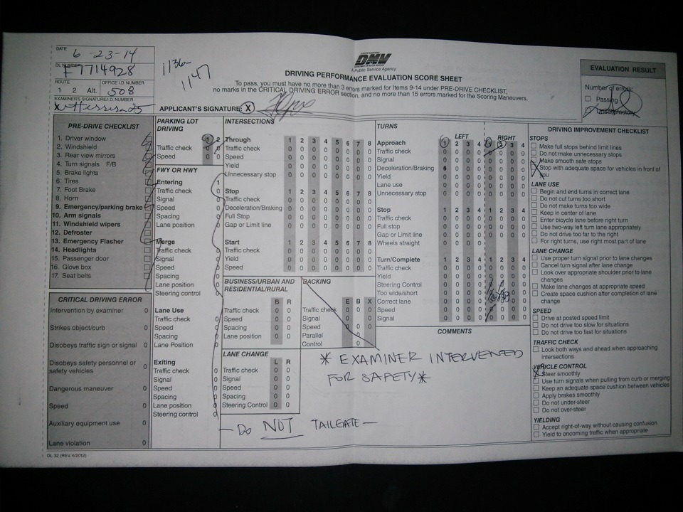 Во-вторых: вам нужно приехать на машине на которой вы будете сдавать экзамен, в сопровождении лица у кого есть Калифорнийские права и свидетельство о регистрации автомобиля.