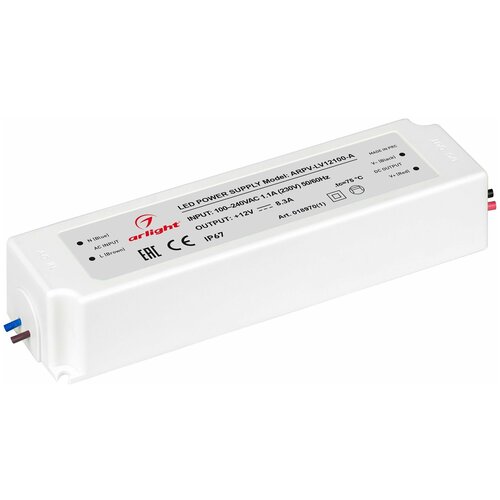 Source de tension avec isolation galvanique pour produits LED. Tension d'entrée 100-240 VCA. Paramètres de sortie : 12 V, 8,3 A, 100 W. PFC intégré >0,5. Boîtier en plastique scellé IP 67. Température de fonctionnement -20…+50C⁰. Dimensions hors tout : longueur 190 mm, largeur 52 mm, hauteur 37 mm. Période de garantie 3 ans 2424,53 frotter.