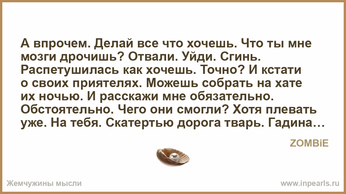 Каждый дрочит как он хочет, я дрочу как я хочу . Сучка не захочет, кобель не вскочет . Именно по этому я не молчу . Чу-чу-чу в своих текстах я шучу . Заебись музяку, для пацанов мучу . А если ты гиббон, спрячь свой выебон . Казенваген ёба, не кроши батон . Интернет писюльки, я вижу вы . . .