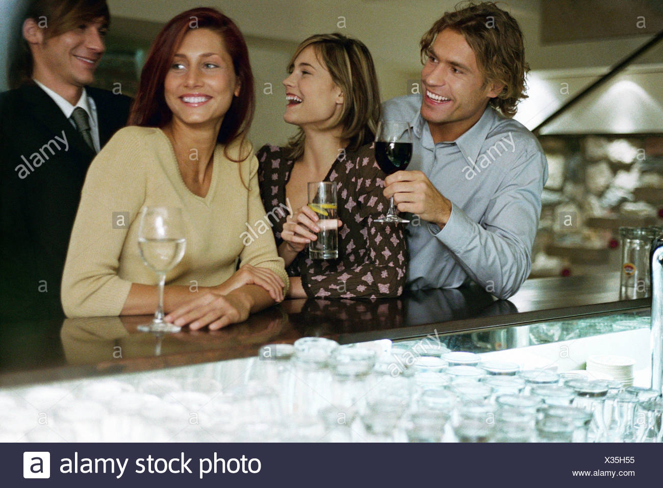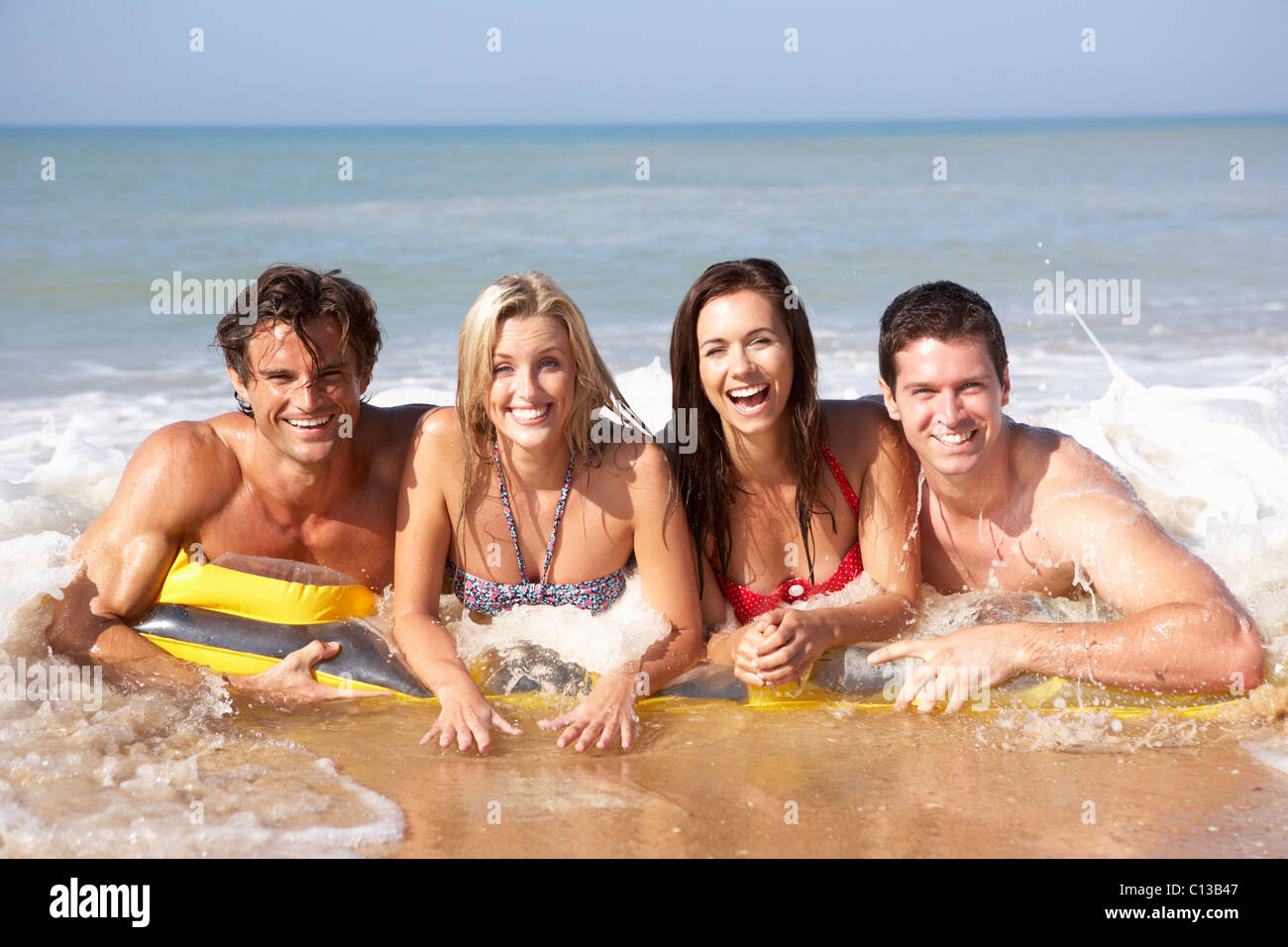 Due, giovani coppie, su, spiaggia Archivio Immagini . . .