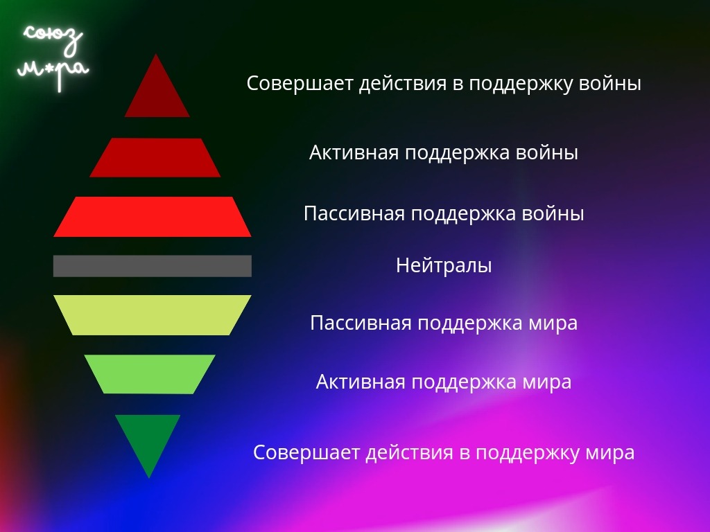 Выше вы можете наблюдать воронку конверсии. Чтобы менять общественное мнение нужно в первую очередь перетягивать на свою сторону колеблющихся людей, а не спорить с идейными zетавцами. Идите по воронке конверсии вверх из центра, от колеблющихся к тем кто пассивен но za и т.д вплоть до активных людей которые поддерживают войну, если хватит сил. Глупо переворачивать пирамиду и начинать с идейных. Вы так просто тратите силы в пустую.