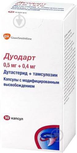 Инструкция к препарату Дуодарт в форме капсул в дозировке 0,5 мг дутастерида/0,4 мг тамсулозина гидрохлорида №30 ( 30 капсул во флаконе) Состав Действующее вещество: дутастерид (Dutasteridum), тамсулозина гидрохлорид (Tamsulosinum hydrochloridum) . В одной капсуле содержится 0,5 мг дутастерида и 0,4 тамсулозина гидрохлорида .