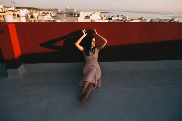 Красотка- брюнетка Ванесса дразнит на своей кровати в розовом топе и маленьких джинсовых шортах .