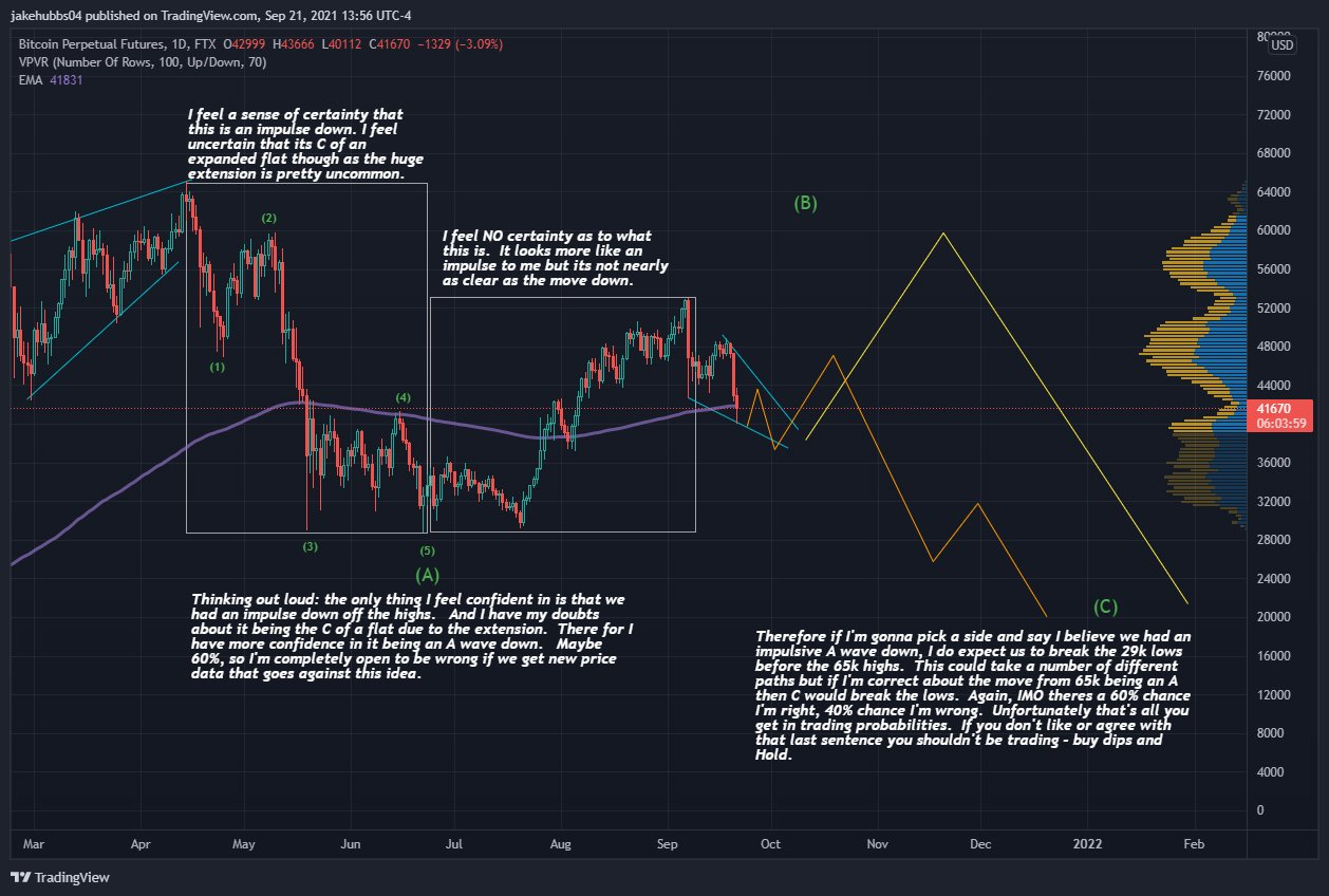 Единственное что можно утверждать сейчас с полной уверенностью, рассматривая динамику BTC в рамках волнового анализа – это то, что снижение от исторического максимума, отмеченного 14 апреля (выделено на графике) представляет собой пятиволновую медвежью импульсную структуру. Однако остается неясным, имеем ли мы дело с волной С (белый цвет) или с началом нового медвежьего импульса.