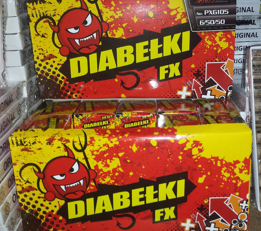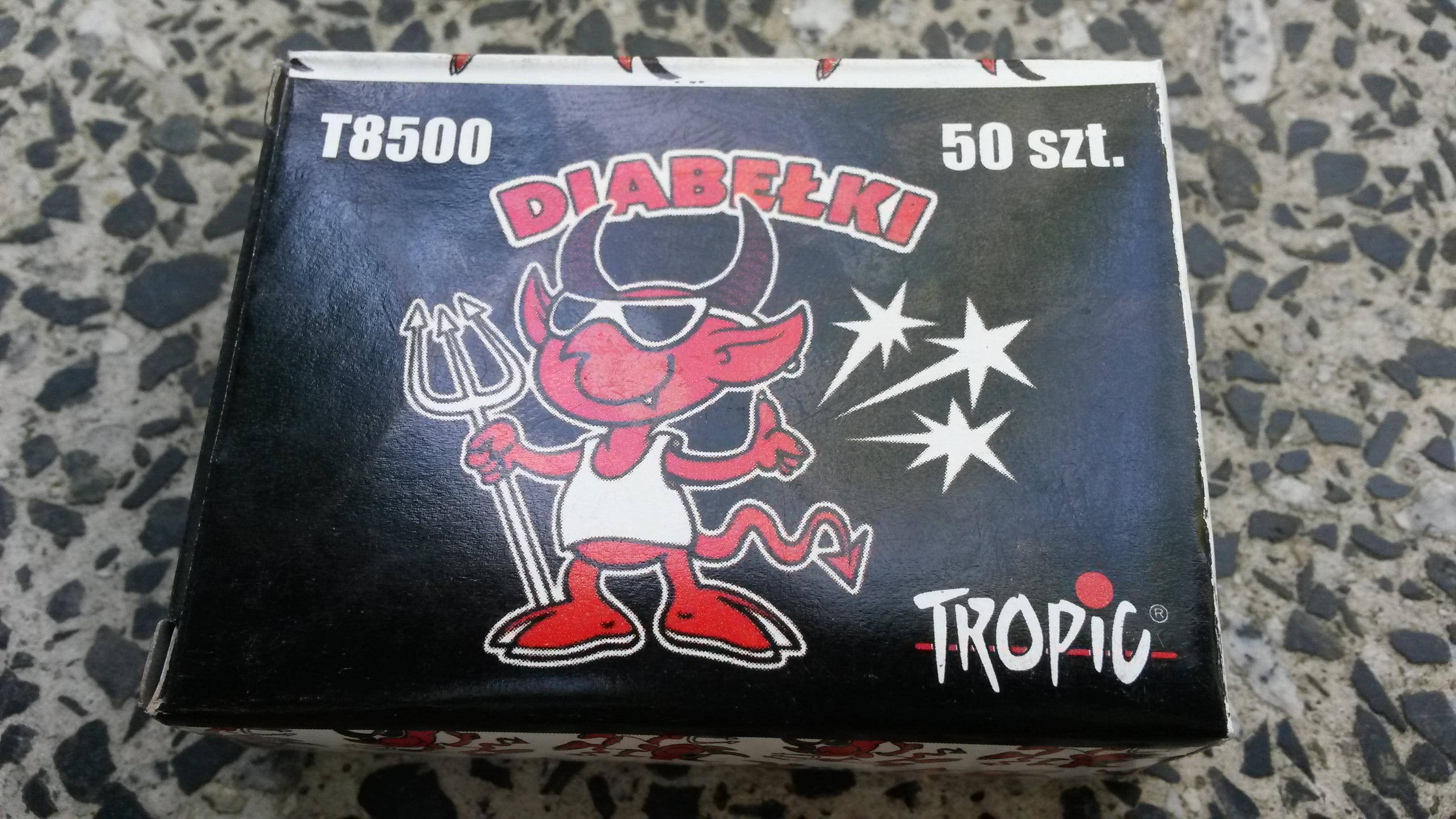 Strzelające diabełki . Strzelające diabełki (znane również jako " diabełki ") to rodzaj małych petard sprzedawanych jako sprzęt do dowcipów . Dwa wyprodukowane komercyjnie diabełki , z których jeden został użyty .