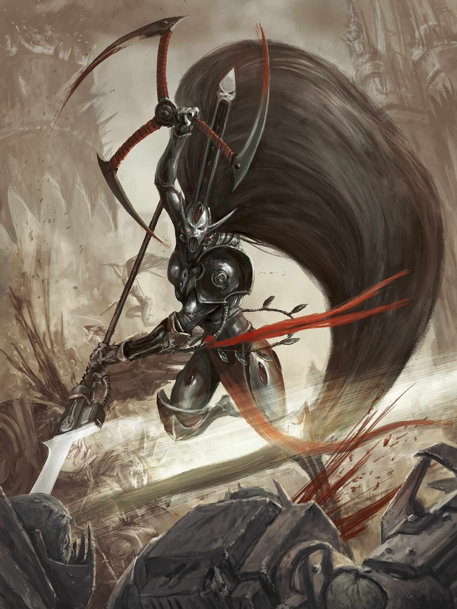И хотя Лорда-Феникса Джайн Зар называют Бурей Тишины, от её яростного вопля у человека может лопнуть сердце или вытечь мозг. В бою она подобна смерчу из сверкающих под кровавым дождём клинков. Тысячелетиями в бесчисленных войнах с Великим Врагом она вела за собой Воющих Баньши, порою собирая их сразу с нескольких миров-кораблей, и с её ненавистью к Тёмным богам сравнятся только её боевые навыки. Увидеть её в бою — все равно что узреть воплощённую ярость эльдар.