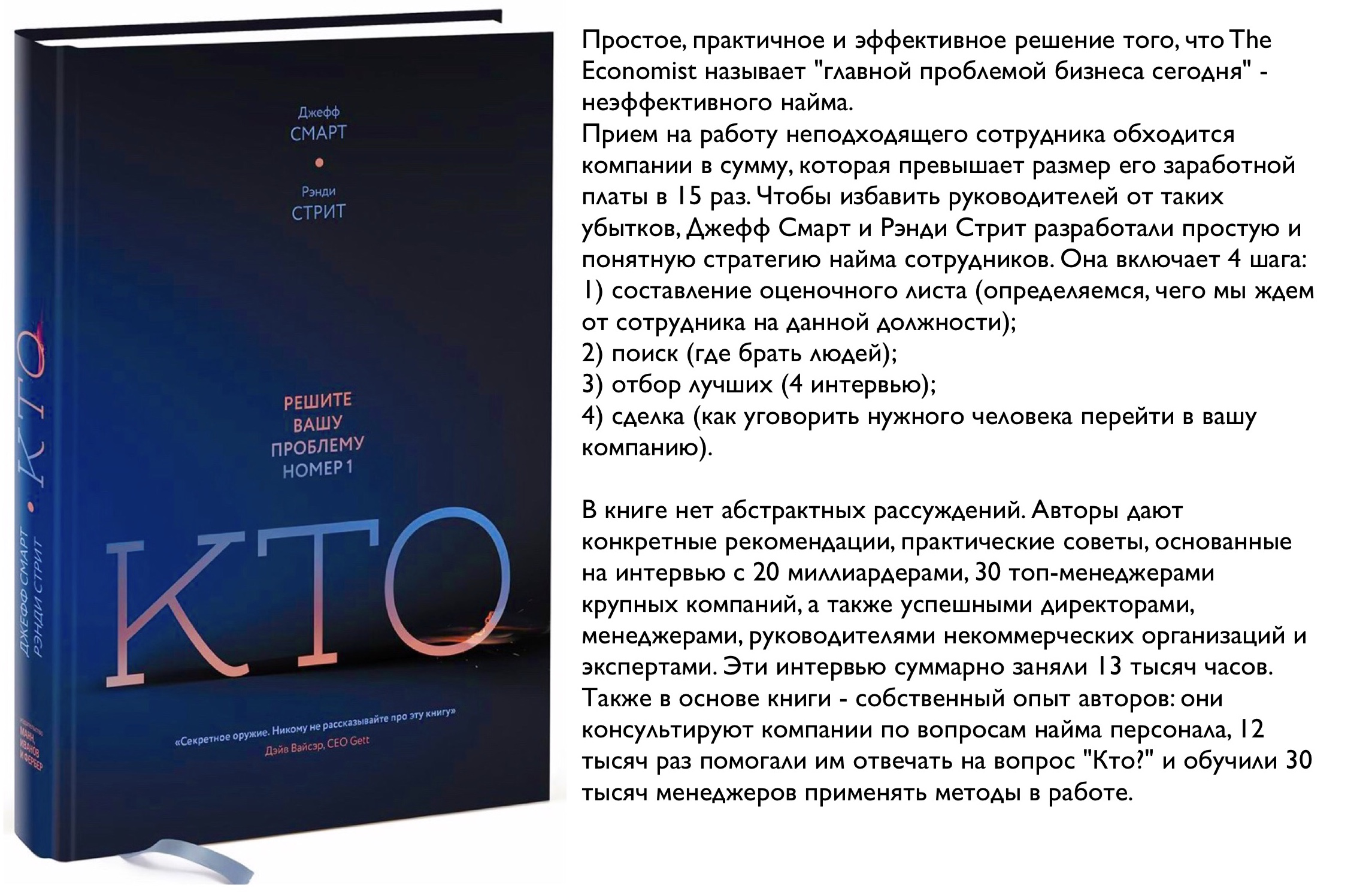 В своей группе ghSMART мы как раз и занимаемся тем, что помогаем компаниям правильно отвечать на вопрос кто. Свое знание человеческого поведения мы поставили на службу топ-менеджерам и инвесторам, желающим создавать успешные предприятия. С 1995 г. учредитель и руководитель нашей компании – Джефф Смарт. Его партнер Рэнди Стрит – исполнительный директор группы. В число наших клиентов входят больше тысячи компаний и начинающих бизнесменов, от ветеранов Уолл-стрит до лидеров некоммерческих организаций. Наши клиенты разбросаны по всему миру: от Ванкувера до Сиднея и от Милана до Тайваня. Мы помогли им более чем в 12 тысячах случаев принять решения кто, и этот опыт лег в основу книги. А кроме того, мы обучили еще 30 тысяч менеджеров применять наши принципы в работе. На протяжении многих лет мы каждый день посвящали отработке нашего метода, однако эта книга – не просто сумма результатов накопленного опыта.