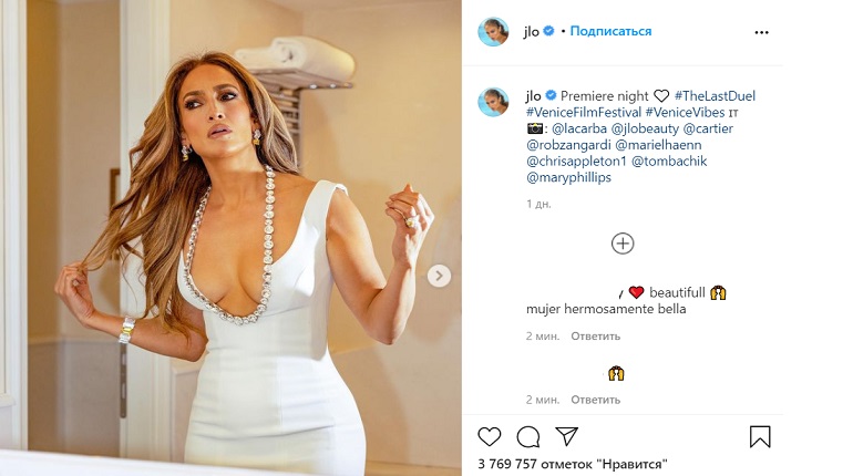 Американская певица и актриса Дженнифер Лопес 14 ноября выложила в Instagram два своих новых снимка - портрет крупным планом и фото в полный рост . На втором снимке 52-летняя артистка позирует в легком облегающем платье с . . .