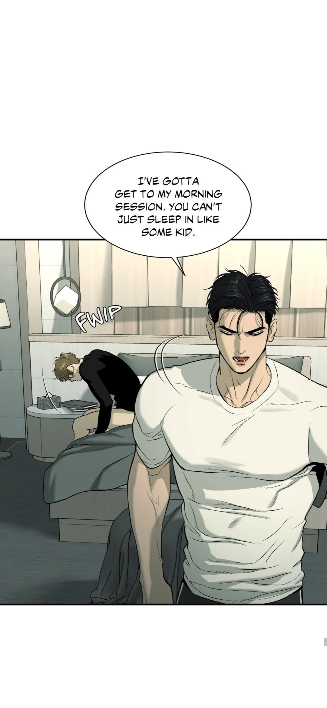 - У меня утренняя тренировка. Ты не можешь так долго тут валяться, как ребёнок какой-то.